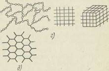 Пространственные или сетчатые полимеры образуются при соединении («сшивке») макромолекул между собой в поперечном направлении прочными химическими связями непосредственно или через химические элементы или радикалы. В результате такого соединения макромолекул образуется сетчатая структура с различной густотой сетки (рис. 1 г). Редкосетчатые (сетчатые) полимеры теряют способность растворяться и плавиться, они обладают упругостью (например, мягкие резины). Густосетчатые (пространственные) полимеры отличаются твердостью, повышенной теплостойкостью, нерастворимостью. Иногда образование пространственной структуры сопровождается даже возникновением хрупкости (смола в стадии резит). Пространственные полимеры лежат в основе конструкционных неметаллических материалов. К сетчатым полимерам относятся также пластинчатые полимеры, которые имеют плоскостное двухмерное строение. Примером такого полимера является графит. Пластинчатая (паркетная) структура показана на рис. 1, д.