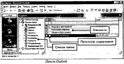 Это программное средство помогает работать с сообщениями, контактными лицами, просматривать совместные документы а также позволяет планировать встречи, поездки и организовать выполнение заданий, отслеживать деятельность свою и сотрудников. Основная панель Outlook содержит следующие разделы: Входящие, Календарь,