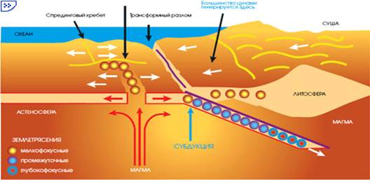 Цунами возникают в следующих условиях. Тектонические процессы, протекающие в глубинах земли, вызывают появление разрывов в толще горных пород. Такие разрывы происходят, как правило, внезапно и сопровождаются землетрясениями. При разрывах, которые дают сбросы, надвиги и сдвиги, образуются смещения горных пород на поверхности земли, и соседние участки перемещаются по ним, причем иногда на десятки метров. Если подобные смещения происходят на дне океана, то, как в толще воды, так и на ее поверхности возбуждается волна, с большой скоростью распространяющаяся во все стороны от места возникновения.