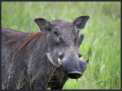 торчат две пары бивней – не что иное, как хорошо развитые клыки. Верхние клыки изогнутые и длинные, могут достигать 60см. Длина тела бородавочника