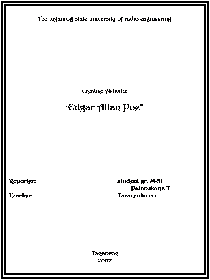 In 1836 he married his young cousin. Through the next decade, much of which was marred by his wife`s illness, Poe worked as an editor for various periodicals. In 1847 his wife died and Poe himself became ill. He died in October 7,1849.