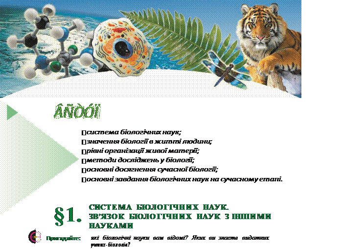 Життя на нашій планеті вражає складністю й різноманітністю проявів. Охопити їх усі в шкільному курсі неможливо, тому ми розглянемо лише основні загальні закономірності. Потрібно пам’ятати, що і тепер, коли б іологія досягла значних успіхів у вивченні живої природи, перед цією н аукою постає багато невирішених питань, на які вчені ще нездатні дати обґрунтовану відповідь. Багато положень сучасної біології є лише припущеннями, і, можливо, ви станете свідками нових видатних від криттів.