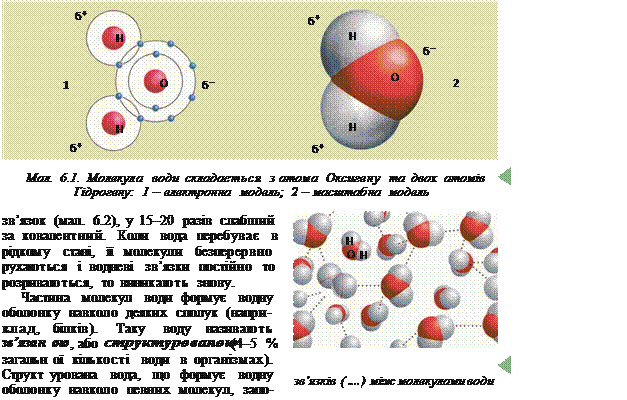Вода утворює основу внутрішнього середовища живих організмів, у якому відбуваються процеси обміну речовин і перетворення енергії. Вода бере безпосередню участь у реакціях розщеплення органічних сполук.