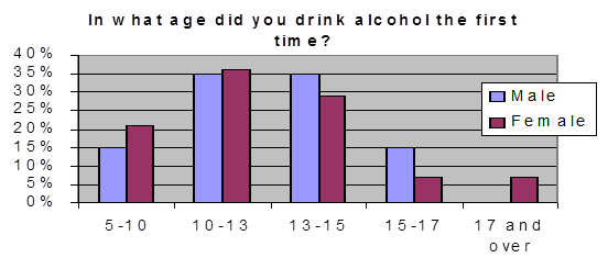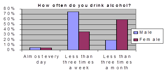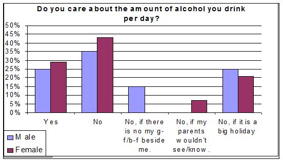 The next few questions I consider to be rather interesting, because they primarily deal with the alcoholic dependency and its stages. The question about drinking alone as one of a symptom of alcoholism brought up the results of 50% of male students who could do this, and only 29% of female who have also chosen this answer. Drinking to overcome a hangover is normal for 55% of men and 14% of women. Doing the same thing at any time except mornings is suitable for 15% and 7% of students respectively. And only 30% of men and 79% of women consider this to be “not their style”. Unfortunately, as much as 85% of men and 64% of women do not need a normal reason for drinking like celebrating some party, etc. Two out of 20 male respondents and two out of 14 female have doubts about their dependency and 2 men consider themselves to be psychologically dependent already.