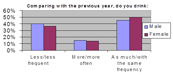 The question concerned ever trying to give up drinking and never following though was aimed to reveal one of the symptoms of the first stage of alcohol dependency. The results were: 30% of men and 14 % of women tried to do so. 25% of men and no females tried to reduce the amount of alcohol consumed and succeeded and 5% and 7% respectively tried but did not succeed in reducing it.