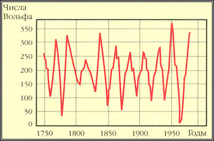 В середине 18-го столетия астрономы любители Г.Швабе и Р.Вольф впервые установили факт изменения числа солнечных пятен со временем, причем средний период этого изменения состовляет ~ 11 лет. Вольф ввел индекс относительных чисел солнечных пятен и сумел по различным материалам наблюдений астрономов-любителей и профессионалов восстановить его с 1749 г. Интервалы времени между годами максимальных (или минимальных) чисел Вольфа довольно сильно различаются. Известно. Что с 1749 г. до наших дней продолжительность их колебалась от 7 до 17 лет между годами максимумов и от 9 до 14 лет между годами минимумов относительного числа солнечных пятен.