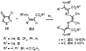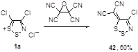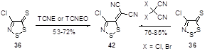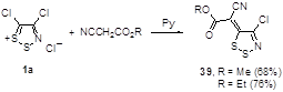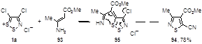 90. Chang Y.-G., Kim K. / Reactions of 4-chloro-5H-1,2,3-dithiazole-5-thione with alpha,beta-unsaturated beta-amino esters: Formation of 2-[2-(1-alkenylsulfanyl-1-alkoxycarbonyl-2-amino)-1,2-dicyano-vinylsulfanyl]-3-amino-2-alkenoic alkyl esters/ J. Heterocycl. Chem., 2002, 39, 29-35.