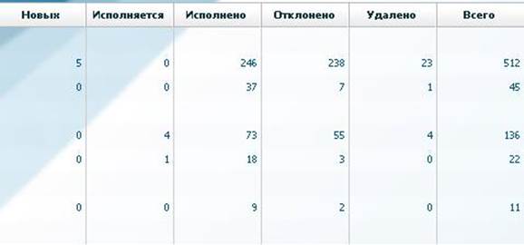 В столбцах слева можно видеть информацию о количестве поступивших заявлений по категориям (новые\ исполняются\ исполнено\ отклонено\ удалено\ всего).