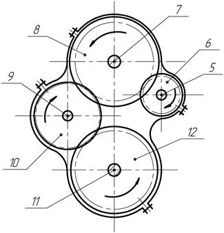 Вал 5 редуктора соединен шлицевой втулкой с валом двигателя. На валу 5 закреплено зубчатое колесо (шестерня) 6, находящееся в зацеплении с колесом 8, закрепленным на валу 7. Колесо 8 находится в зацеплении с промежуточным (паразитным) колесом 10, закрепленным на валу 9 и находящимся в зацеплении с колесом 12, закрепленным на валу 11. Валы 7, 9, 11 соединены с валами барабанов. Расположение барабанов показано на рисунке 5.2, в.
