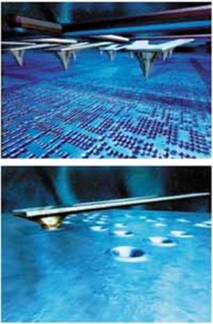 В отличие от наиболее распространенных сегодня оптических, магнитных и электронных устройств хранения данных, Millipede использует принцип механической записи: микроскопические иглы продавливают углубления на поверхности тонкой пластиковой пленки. Каждое из этих углублений соответствует одному биту записываемой информации. Если абстрагироваться от технических подробностей, то Millipede очень напоминает один из старейших цифровых носителей — перфокарту1 . Правда, в отличие от существующих уже более 110 лет однократно записываемых перфокарт, Millipede предусматривает возможность многократной перезаписи и обладает значительно большей удельной плотностью — на площади, эквивалентной одному отверстию классической перфокарты (которое соответствует одному биту), может уместиться более 3 млрд. (3×109) бит информации. А теперь ненадолго перенесемся в микромир и рассмотрим внутреннее устройство накопителя Millipede.