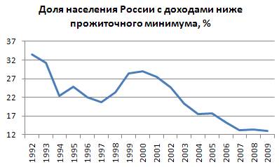 Динамика доли населения России с денежными доходами ниже прожиточного минимума в 1992—2009 годах, в процентах