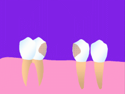 Вторым же методом является непонятно почему редко выполняемый метод восстановления мостовидной конструкцией с опорой на вкладки. Метод прост и ясен как день. Если соседние зубы имеют кариозные полости, и эти полости прилегают к дефекту, то, удалив кариес, мы получаем хорошо отпрепарированное ложе для так называемой вкладки, на которой и крепится искусственная коронка, восстанавливающая удаленный зуб. Вот как это выглядит: