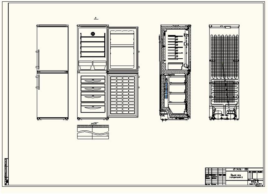 Графическая часть КП выполняется в среде AutoCAD -, и включает: Общий вид холодильника, компоновочные схемы агрегата, схема холодильника. сборочный чертеж компрессоров для холодильной и морозильной камеры.