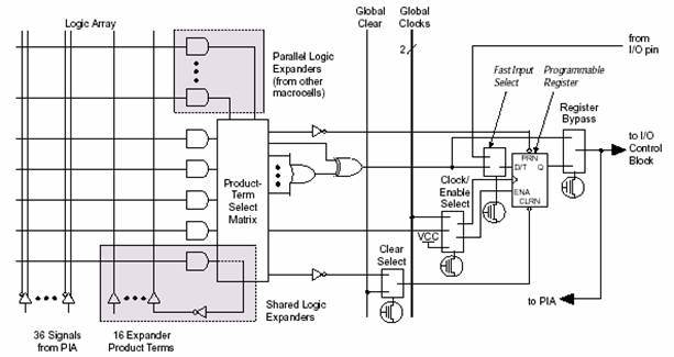 ) и удовлетворяют требованиям стандарта PCI по уровням сигналов. Имеется возможность индивидуального программирования цепей сброса, установки и тактирования триггеров, входящих в макроячейку. Предусмотрен режим пониженного энергопотребления. Программируемый логический расширитель позволяет реализовать на одной макроячейке функции до 32 переменных. Имеется возможность задания бита секретности (security bit)