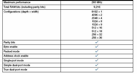· наличие внутреннего блочного ОЗУ, один блок имеет ёмкость 4 кбит (семейства Virtex, Virtex-E, Spartan-II, Spartan-IIE) или 18 кбит (семейства Virtex-II и Virtex-IIPro), всего блоков до 556 на кристалл