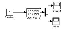 Для моделирования использовался математический инструментарий simulink. Структура модели программы приведена на рис. , Окно модели и полученные графики переходных процессов приведены на рис. . Как уже было сказано, эти графики справедливы только до момента пересечения ими оси абсцисс.