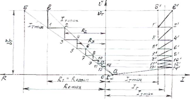 величинам сопротивлений ступеней тормозного реостата, а отрезки 1-2, 3-4 и т.д. - частям (секциям) тормозного реостата, которые нужно выводить (отключать) для обеспечения колебания тока от Iт