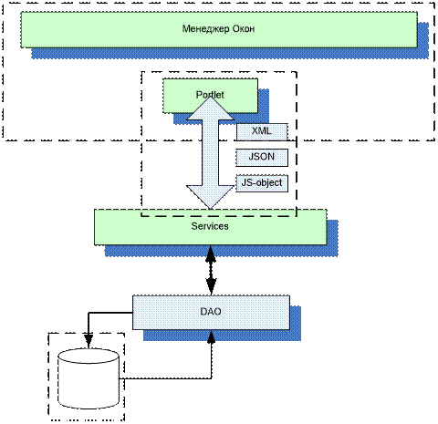 Рассмотрим простую абстрактную модель приложения основанную на SOA – архитектуре (Рис 10 Простая абстрактная архитектура приложения). В такой системе, менеджер окон может выступать как прослойка между работой с сервисами (обрисовка окон) и работай пользователя (работа и компоновка окон). Таким образом мы можем рассматривать новый подход к созданию WEB-приложений и WEB-интерфейсов, похожий на стандартный подход в реализации корпоративных приложений.
