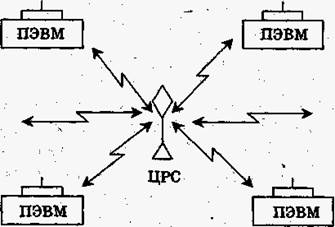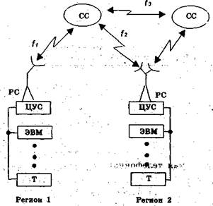 Применение космических спутников связи привело к возможности создания глобальных радиосетей. Средства коммуникаций включают спутники связи (СС), наземные радиостанции (PC) и проводные каналы связи между ЭВМ и PC (рис.3.3.1.).
