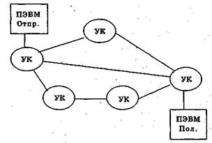 Коммутация каналов устанавливает физическое соединение (рис.3.2.3.1.) между абонентом-отправителем сообщения (Отпр.) и получателем (Пол.). Отправитель посылает специальный сигнал, который перемещается от одного УК к другому и устанавливает физический прямой канал связи между отправителем и получателем. После установления физического канала связи получатель посылает об этом отправителю специальный сигнал. Получив сигнал, отправитель посылает сообщение. После передачи всего сообщения канал связи разъединяется. Способ коммутаций каналов прост в реализации, но дает наибольшую задержку при передаче сообщения и снижает пропускную способность сети.