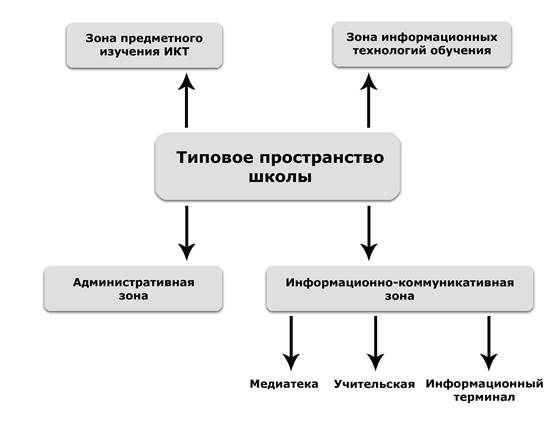 Зона информационных технологий обучения. Учебная аудитория, в которой должны присутствовать: современный компьютер, подключенный к локальной сети школы и имеющий доступ к глобальным информационным ресурсам, мультимедийный проектор, подключаемый к компьютеру. В данной аудитории можно проводить уроки по различным предметам с использованием ИКТ, не загружая компьютерный класс.