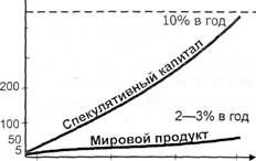 Рис.1 «Динамика разрыва между спекулятивным капиталом и обеспеченным реальной мощностью мировым продуктом»