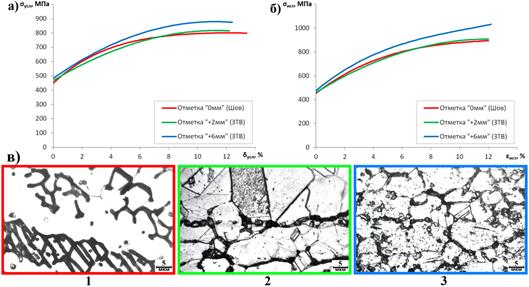 Из диаграмм изображенных на рисунке 6 (а, б) видно, что по мере отдаления от зоны шва прочность материала возрастает при сохранении пластичности. При этом зоны сплавления и термического влияния на отметке «+2», несмотря на большие различия в структуре, в целом совпадают. Механические характеристики сварного шва приведены в таблице 2: