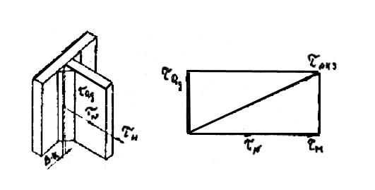 Так как при расчете угловых швов не учитывалась поперечная нагрузка, которую по условной методике расчета воспринимают только вертикальные швы, производим проверку выбранных швов по расчетным напряжениям в т. 1 (см. рис. выше). В этой точке действуют касательные напряжения от момента и от поперечной нагрузки :