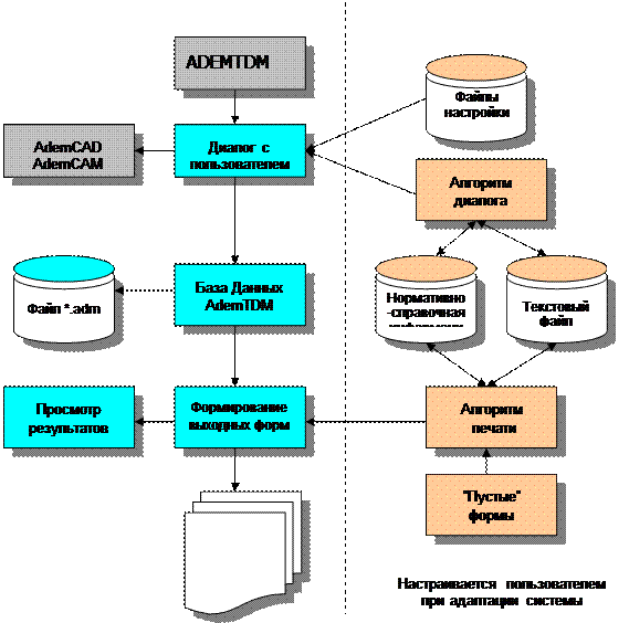 Диалог с пользователем создается на основе файлов инициализации и алгоритмов, формируемых пользователем при адаптации системы. В результате работы диалога создается база данных AdemTDM (БДА), которая является основой для формирования документации. БДА можно сохранить в ADM-файле (*.adm) и в дальнейшем использовать для текущего редактирования или для создания нового как прототип.