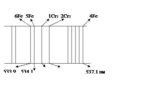 4. Визуально определяют соотношение интенсивностей аналитических пар в спектре, после чего, пользуясь стилоскопическими таблицами (Свентицкий Н.С. Визуальные метода эмиссионного спектрального анализа), дают оценку содержания элемента. В качестве примера в табл.7 и на рис. 7 приведены характерные линии и спектроскопические признаки для оценки содержания хрома в стали с медным противоэлектродом.