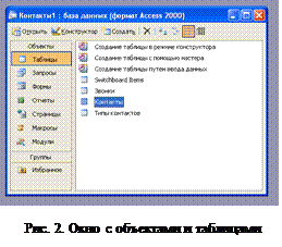 В нем выберите «Таблицы» и среди таблиц ту, в которой меняется набор полей. Например, «Контакты». Затем нажмите кнопку «Конструктор», или щелкните по названию таблицы правой клавишей мыши (ПКМ) и выберите «Конструктор». Появится список полей таблицы, где указаны их имена, типы и др. информация. Здесь поменяйте имена полей на нужные по варианту, лишние удалите. Для удаления щелкните ПКМ слева от имени поля. Чтобы добавить поле, впишите в конец списка его название, справа выберите тип (текстовый, числовой и т.д.). В конце закройте окно со списком с сохранением изменений. Для создания таблицы выберите пункт «Создание таблицы с помощью мастера» (рис. 2). Далее следуйте указаниям мастера создания таблиц: выберите из списка поля, задайте имя таблицы (связи можно не создавать) и нажмите «Готово».