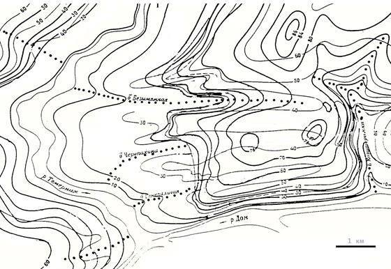 Верхний рисунок (по К.А.Меркуловой, 2006 г.): тонкие линии – горизон-тали, утолщенные – гидроизогипсы; точками показаны тальвеги балок. Нижний рисунок (по Хрусталеву Ю.Н. и др. 2001 г): горизонтали рельефа и основные транспортные магистрали.