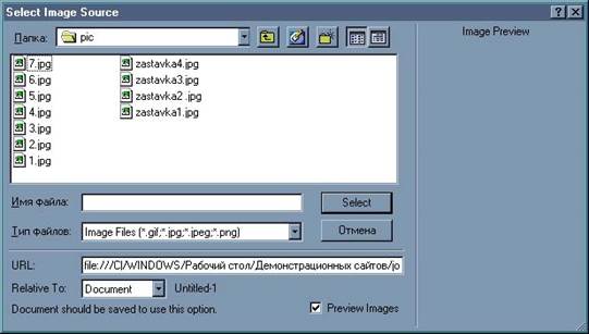 Поставьте курсор в любую ячейку таблицы, и выполните команду Insert –Image. Появится диалоговое окно: