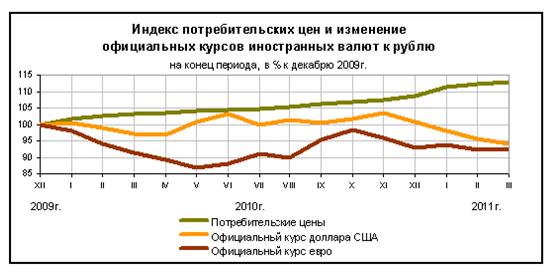составила 3,8% (годом ранее – 3,2%), в т.ч. в марте она составила 0,6% (0,8% в феврале), после 2,4% в январе (см. рис.1). В годовом выражении по состоянию на март 2011 г. инфляция составила, как и в феврале, 9,5% (в январе – 9,6%). Главным фактором замедления инфляции стало существенное снижение темпов роста цен на продовольственные товары, на что, по оценке Минэкономразвития, повлияли меры Правительства Российской Федерации по насыщению продовольственных рынков (обнуление ввозных пошлин на картофель и овощи, и ряд других товаров, зерновые интервенции и др.).