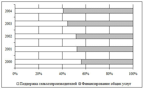 . В то же время расходы на общие услуги, то есть на формирование институтов и инфрастуктуры сельского хозяйства, что наиболее дефицитно в экономиках переходного типа и что входит в «зеленый ящик» (меры, не подлежащие ограничению по правилам ВТО), находят очень слабое отражение как в федеральном, так и в бюджетах субъектов федерации.