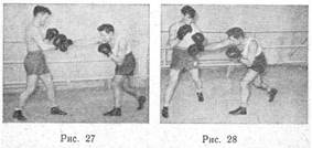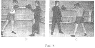 2) в начальной стадии обучения следует воздерживаться от ударов правой рукой. Правая рука в основном должна выполнять в этой стадии защитные функции. Это необходимо потому, что юноши-новички, увлекаясь ударами, зачастую забывают о защите, в то время как они в первую очередь должны научиться четко и экономно защищаться.
