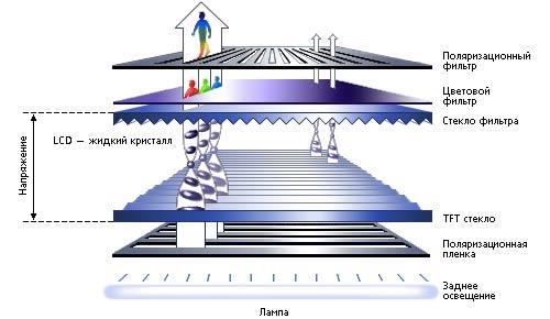 Свет направляется на поляризационный фильтр. Далее следует стеклянная пластина, на которую нанесены полупрозрачные электроды из пленки окислов индия и олова, формирующие пикселы изображения. Затем идет полимерная пленка с микробороздками, ориентирующими молекулы жидких кристаллов, составляющие следующий слой. Вторая половина - все с точностью до наоборот (за исключением подсветки).