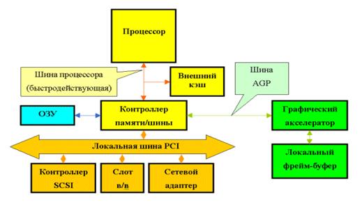 Шина AGP соединяет всего одно устройство (AGP-мастер) с AGP-контроллером в составе системного чипа - "северного моста", а тот, в свою очередь, связан с контроллером памяти. Таким образом, пересылка данных между видеочипом и памятью производится по выделенному каналу - шине AGP. Для оптимальной загрузки этого канала все запросы на чтение и запись имеют приоритеты и выстраиваются в очереди, причем сам запрос и транзакция (акт передачи блока данных) не обязательно следуют друг за другом. Транзакции могут выполняться как в стиле PCI, так и AGP, когда данные передаются только в направлении "память-мастер". То есть смысл шины в том, чтобы предоставить видеочипу возможность обращаться за данными в основную память по своему, отдельному каналу.