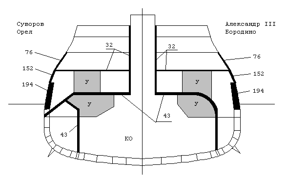 Аналогичное расположение палубной брони было принято и на третьем броненосце типа «Бородино» - «Орле», намеченном к постройке на «Галерном островке» (с машинами и котлами Балтийского завода), а также на броненосцах №4 и №5, заказанных Балтийскому заводу. Эти два корабля после