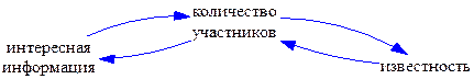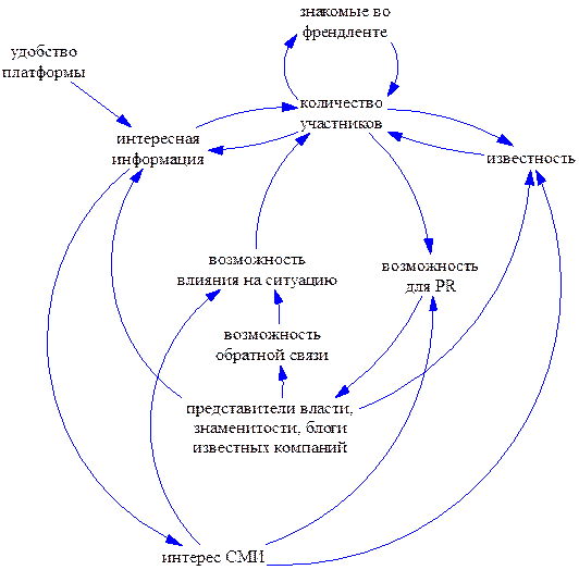 Для того чтобы отразить моё видение механизма того, как росла популярность ЖЖ, я построю причинно-следственную диаграмму. Рост каждой переменной в данной диаграмме приводит к росту переменной, с которой она связана стрелкой.