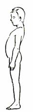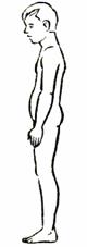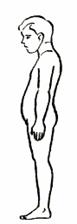 (тотальный кифоз) - нарушение осанки, связанное со значительным увеличением грудного кифоза и отсутствием поясничного лордоза. Шейный отдел позвоночника частично, а у дошкольников бывает и полностью кифозирован. Для компенсации отклонения проекции общего центра масс кзади дети стоят и ходят на слегка согнутых ногах. Угол наклона таза уменьшен и это тоже способствует сгибательной установке бедра относительно средней линии тела. Голова наклонена вперед, надплечья приподняты, плечевые суставы приведены, грудь западает, руки свисают чуть впереди туловища. Круглая спина часто сочетается с крыловидными лопатками 2 степени.