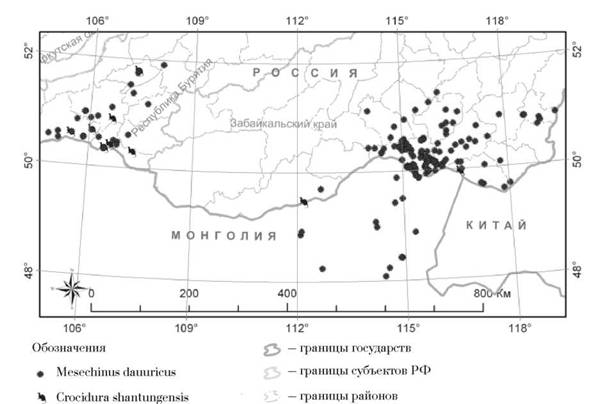 Рис. 5. Карта распределения малой дальневосточной белозубки в пределах Забайкальского района (Забайкальский край). Обозначения см. на рис. 2