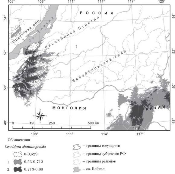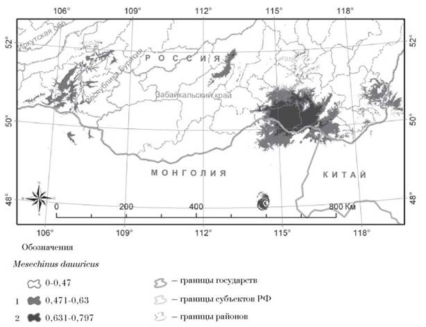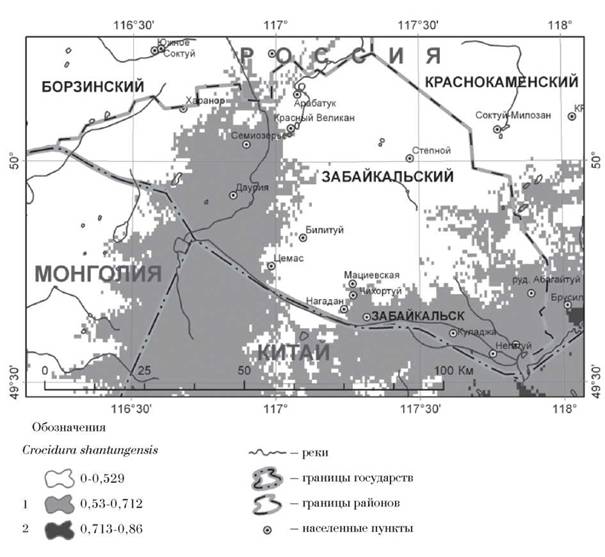 Рис. 3. Результаты биоклиматического моделирования распространения малой дальневосточной белозубки в Южном Забайкалье и прилегающих территориях Монголии и Китая. Обозначения см. на рис. 2