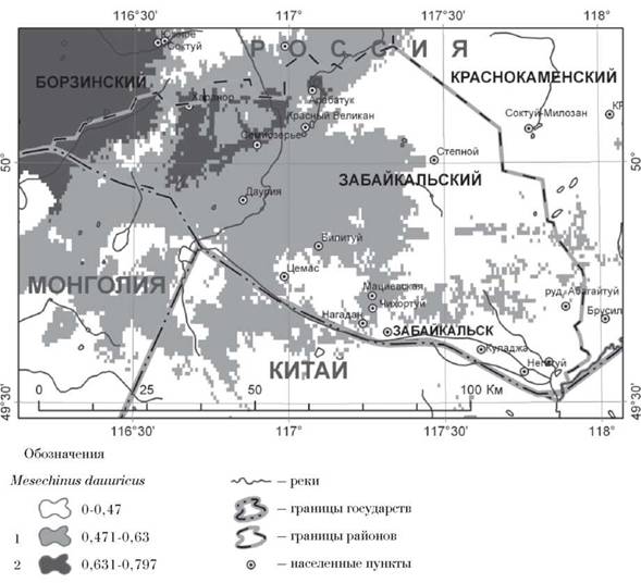 Крупномасштабное картирование. Размещение исследуемых видов с целью выяснения положения границ ареала и оптимума на карте крупного масштаба рассмотрено на модельном участке Забайкальского района (Забайкальский край). Его выбор связан, в первую очередь, с перспективами создания в этой части Забайкальского региона международного трансграничного заповедника [5, 8, 9, 10, 22]. Кроме того, Программа сотрудничества между регионами Дальнего Востока, Восточной Сибири РФ и Северо-Востока КНР (2009-2018) предусматривает создание на юго-востоке Забайкальского края предприятий по разработке горнорудных месторождений [3]. Реализация этих планов обострит имеющиеся проблемы в сфере охраны окружающей среды, под действием новых антропогенных рисков усилится негативное воздействие на экосистемы этих территорий [4, 11, 16,