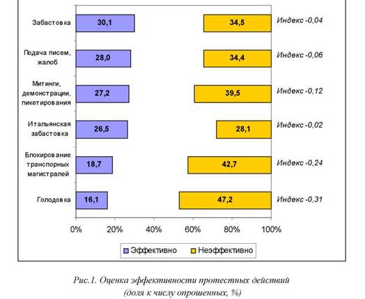 Самое высокое положение в рейтинге эффективности занимают «работа по правилам», забастовки и обращения в органы власти и правоохранительные структуры. Значения индексов (-0,02, -0,04 и -0,06) указывают на примерно равное соотношение численности групп, признающих и не признающих действенность этих видов протестной активности. Интересен тот факт, что самые радикальные действия, которые в прошлом неоднократно приносили рабочим успех (голодовки, блокирование транспортных магистралей), в настоящее время рассматриваются как наименее эффективные. Значения индексов составили для этих видов активности (-0,31) и (-0,24) соответственно.