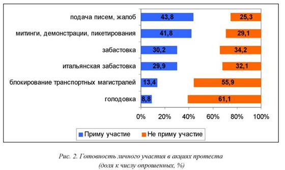 В то же время в большинстве случаев включенность в протестные действия ограничивается, по-видимому, моральными формами поддержки. Потенциал реального участия работников в акциях протеста оказался значительно ниже заявленного. Наибольшую готовность личного участия (42-44%) работники проявляют в отношении форм протеста, которые не наносят прямого ущерба производству (подача писем, жалоб; организация митингов, демонстраций). Примерно треть респондентов выразила готовность принять участие в традиционной либо «итальянской» забастовке. Мобилизационный потенциал наиболее радикальных акций (голодовка, блокирование транспортных магистралей) ограничивается 9-13%. Это достаточно высокий показатель, если учитывать, что люди, готовые включиться в подобные акции, чаще всего находятся на грани отчаяния.