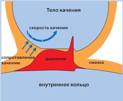Тела качения контактируют с наружным и внутренним кольцом, что при вращении приводит к трению проскальзывания. Потери энергии связаны с трением скольжения тел качения о сепаратор, внутренним трением в материале контактирующих тел (упругие деформации), сопротивлением смазки.