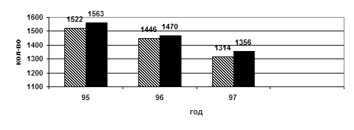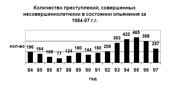 Приведенная выше диаграмма наглядно свидетельствует о крайне опасной тенденции увеличения количества преступлений, совершенных несовершеннолетними на территории Новгородской области в период с 1984 по 1997 годы. Как видно, эта тенденция имеет довольно устойчивый характер и, что особенно важно отметить, рост преступлений подростков продолжался несмотря на всю активную работу государственных органов, направленных на борьбу с преступностью несовершеннолетних. Нельзя не признать, что в 1996 и 1997 годах наметилось снижение количества преступлений в сравнении с 1995 годом на 6% и 13,2 % соответственно. Но тем не менее, уровень преступности продолжает оставаться на крайне высокой отметке и в сравнении с самым «благополучным» 1984 годом составляет 230%. Поэтому вопрос о способах профилактики и необходимых мерах, направленных на коренной перелом сложившейся тревожной ситуации становится в настоящее время особенно актуальным, так как ранее принимаемые меры, как видно, не достигли своей цели. Следовательно, необходимо проведение серьёзного изучения проблемы преступности несовершеннолетних на территории Новгородской области для того, чтобы выработать новые, более прогрессивные и эффективные способы профилактики и борьбы с подростковой преступностью, которые бы отвечали реалиям нашего времени.