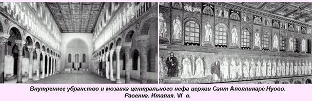 Правда, представления о том, как подобные принципы реализуются, менялись. Интересны мозаичные памятники VII века (например, церковь Сант Аполлинаре ин Классе в Равенне). Ощущается отход от торжественно-величавых идеалов, преобладавших в VI веке.
