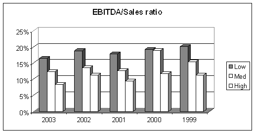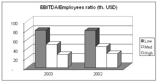 По показателю прибыльности активов картина получается более сглаженной. Разница в пользу специализированных компаний составляет около 130%, или, в абсолютных величинах, соответственно, 22% против 9% у широкодиверсифицированных. Интересно, что по показателю использования активов компании со средним уровнем диверсификации оказываются значительно ближе к фирмам, использующим концентрированные модели бизнеса. Их показатель EBITDA/total assets составляет в среднем 17%. Более того, по данным за 2002 год компании со средним уровнем диверсификации показали лучшие результаты, чем концентрированные компании.